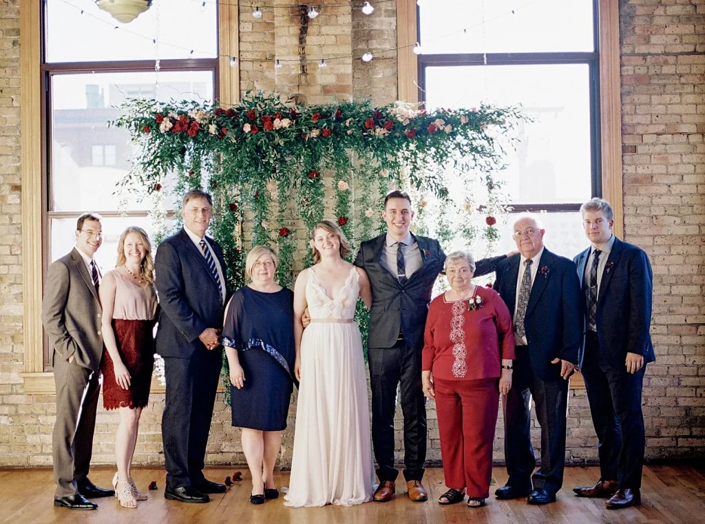 Wedding Planning: Rosetree Weddings & Events | Photography: Marc Andreo Photography |Venue: Day Block Event Center | Florals: Studio Emme Floral| Catering: Brasa Catering & Big 10 Catering | Cake: Lucia's | Entertainment: The High 48s | Getting Ready + First Look Venue: The Renaissance Depot | Hair & Make-up: Primped| Bridal Dress Designer: Truvelle |Bridal Dress Store: a&bé Bridal Shop Minneapolis | Bride Shawl: Handmade DIY |Groom Attire Designer: Hugo Boss | Ties: Fredrick Thomas Etsy Shop | Groom Attire Store: Nordstrom | Bridesmaid Dress Designer: BHLDN | Jewelry: Davie & Chiyo | Stationery: Minted |Bartenders: Minnesota School of Bartending